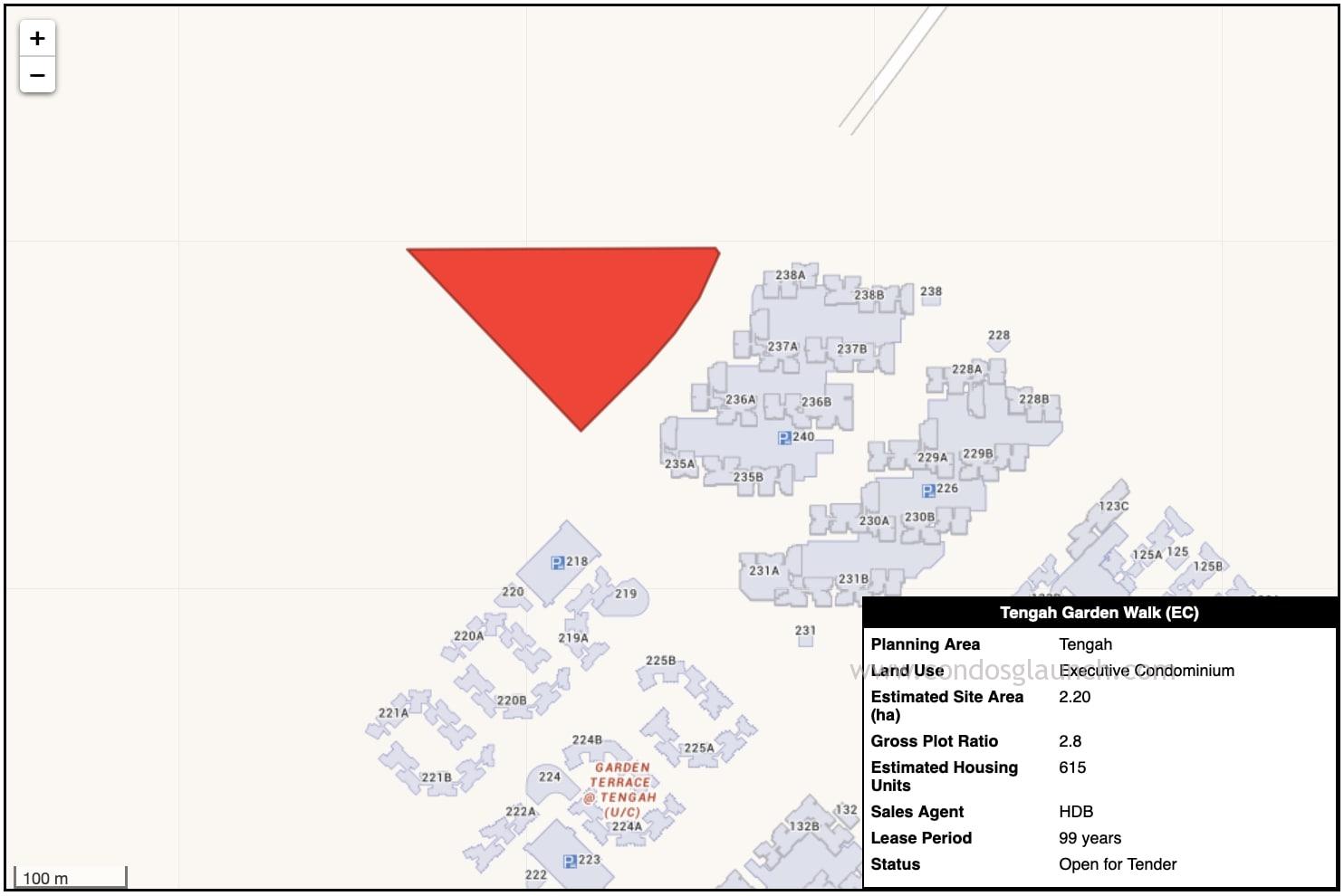 The Tengah Garden Walk EC site takes up 2.2o hectares of land area, with a plot ratio of 2.8. It can build approximately to 36 storey. The estimated number of EC housing units is 615.
